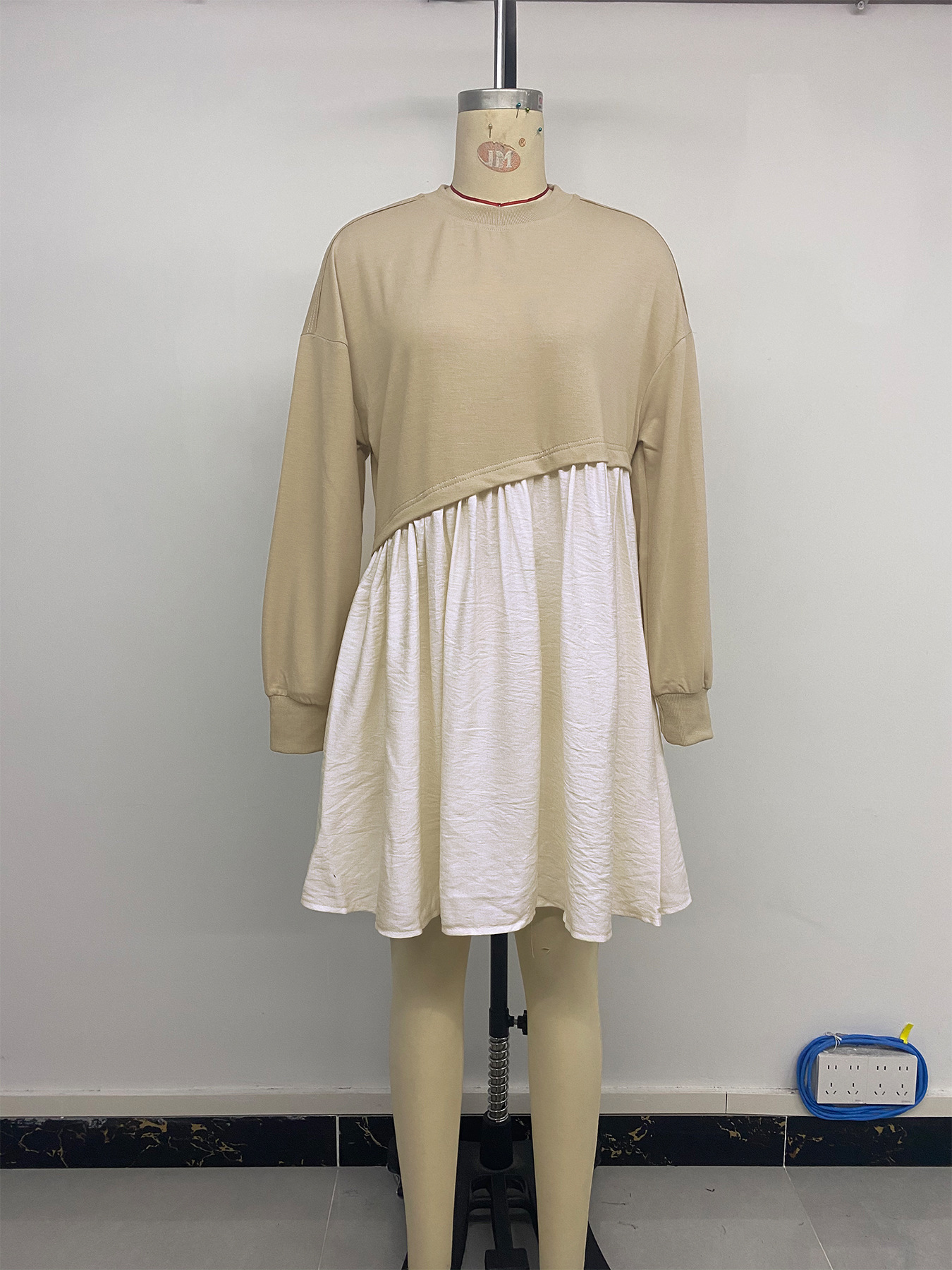 Personal Leisure Date Round Neck Long Sleeve Color Matching Loose Dress